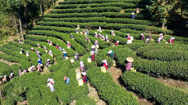 采茶工人们穿梭在茶园中,现场一片采茶繁忙好“丰”景